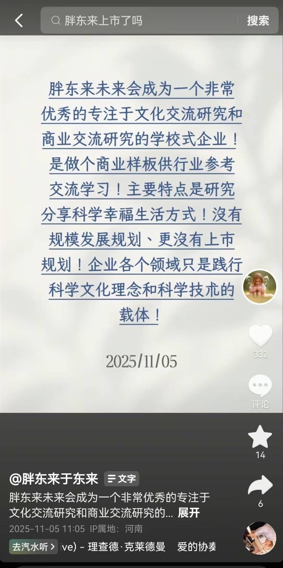11月5日,胖东来创始人于东来在社交平台发文:“胖东来未来会成为一个非常优秀的专注于文化交流研究和商业交流研究的学校式企业!是做个商业样板供行业参考交流学习!主要特点是研究分享科学幸福生活方式!沒有规模发展规划、更沒有上市规划!企业各个领域只是践行科学文化理念和科学技术的载体!”