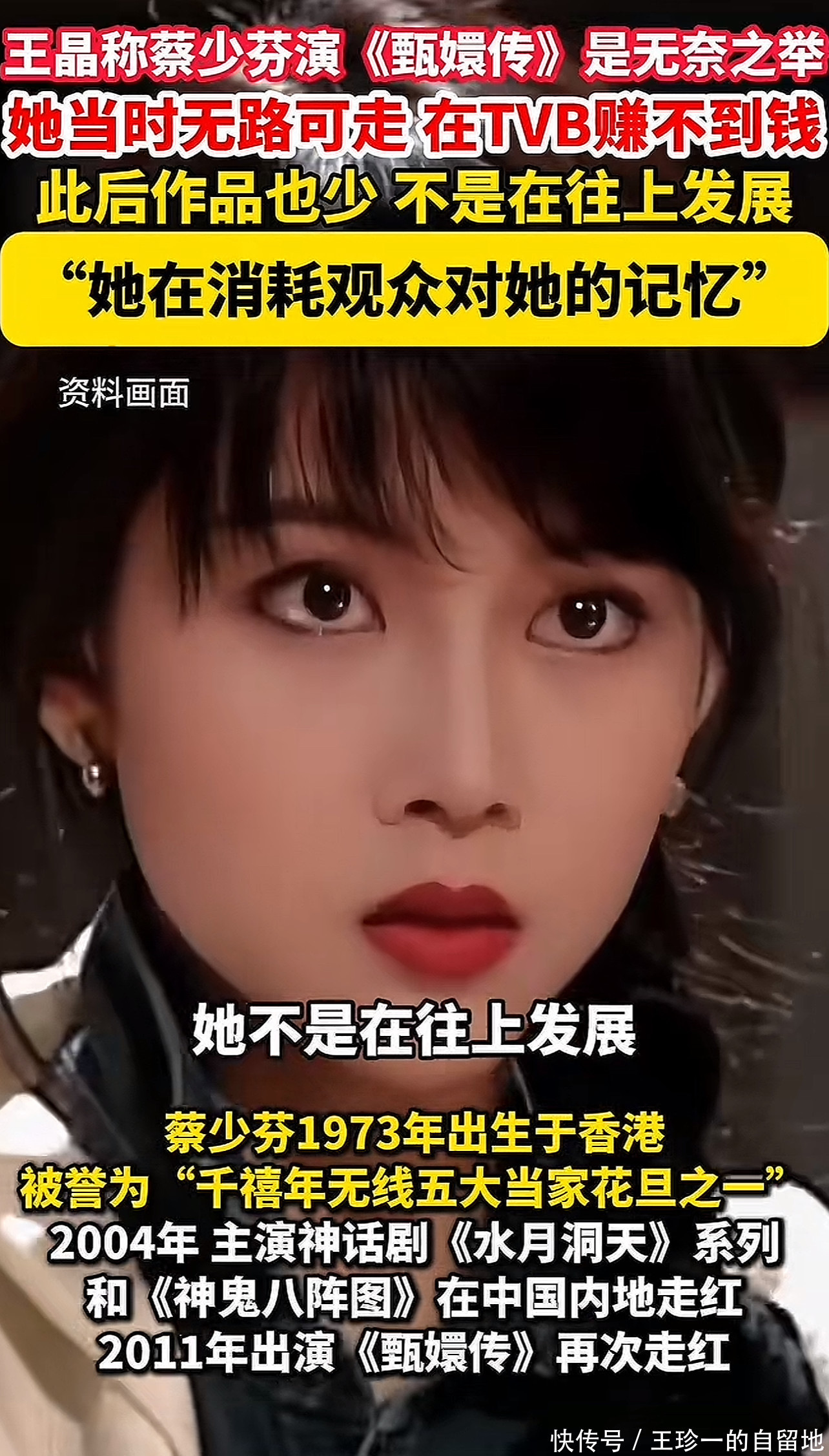 随后,王晶又说在《甄嬛传》之后,蔡少芬没有什么大戏,直言她不是在往上发展,而是消耗观众对她的记忆。