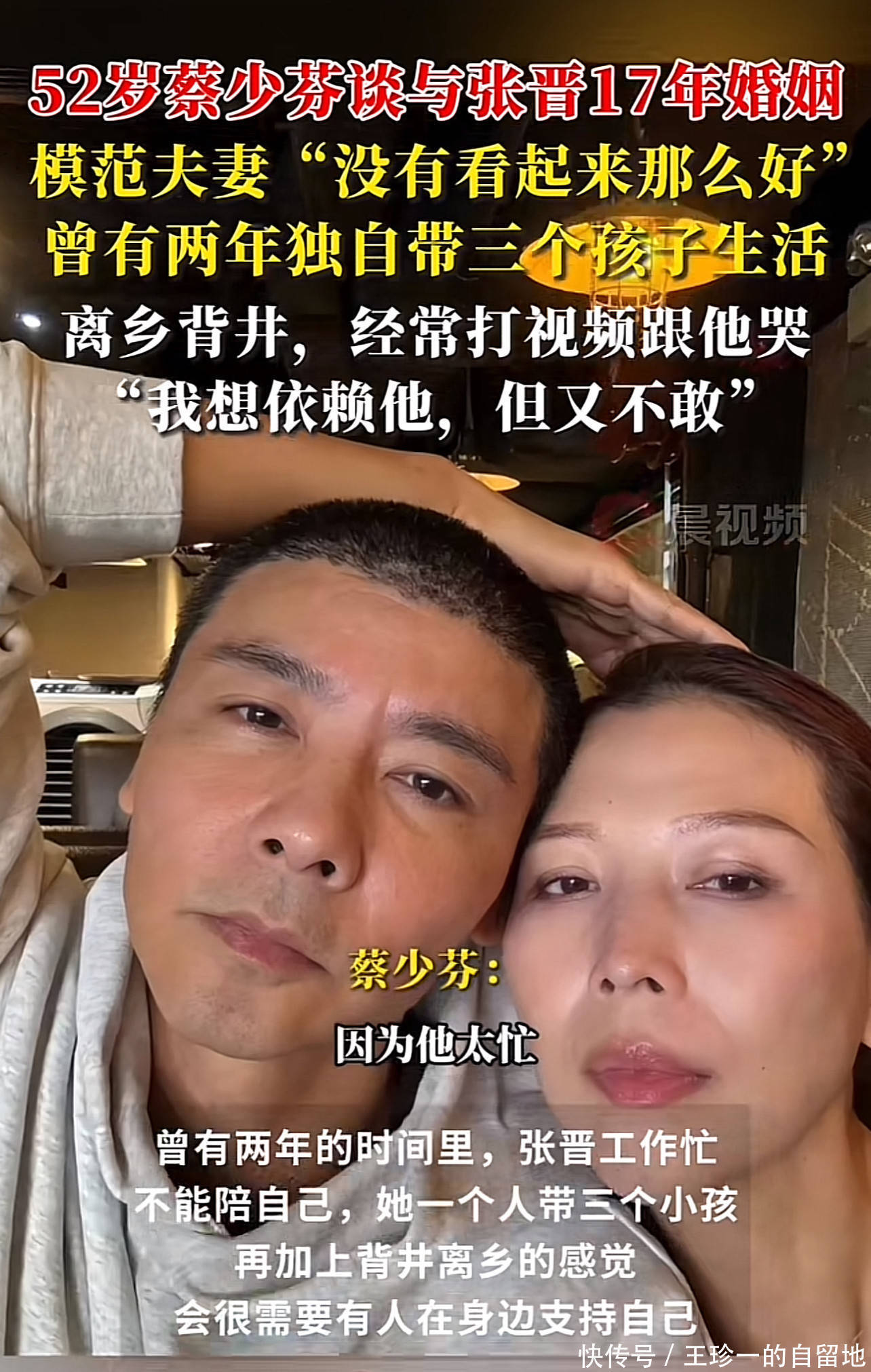 蔡少芬曾透露有2年她要独自带3个孩子,想依赖张晋也依赖不上,因为张晋在外面拼事业。